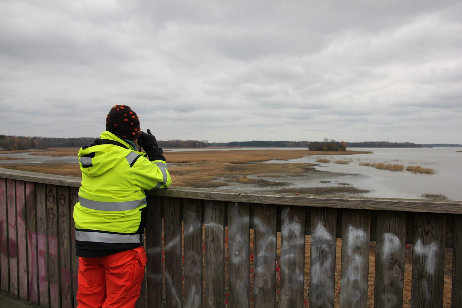 Pysähdyimme lintutornin läheiselle levähdyspaikalle. Siellä oli penkki, joka näytti kuivalta, mutta istahtaessani siihen vaihtamaan pelastautumispukua päälleni, huomasin syksyn kosteuden. En ehtinyt varoittaa Päiviä, hän istahti samalle märälle penkille. ”Kannattaisi varmaankin laittaa pelastautumispuku päälle.” ”Pärjään kyllä näillä saappailla, varret ylettyvät lähes polviin.”
